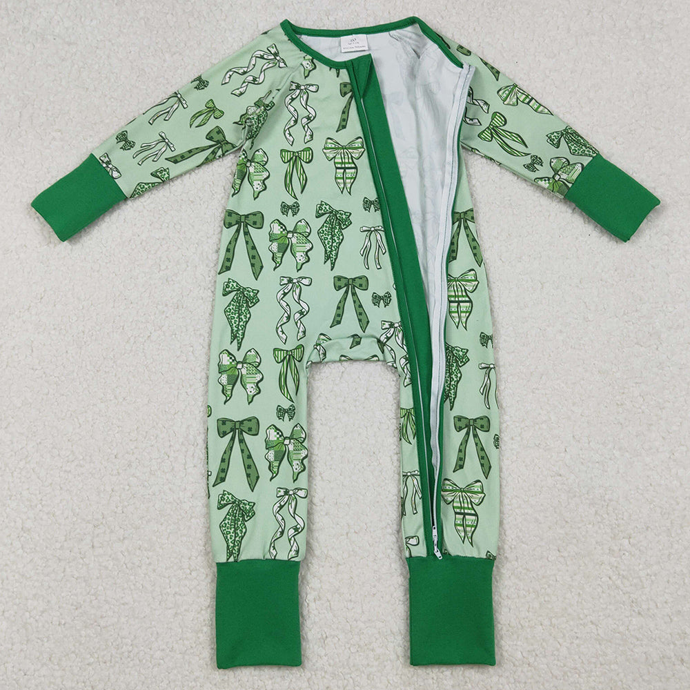 Baby Girls Rompers Green Clover Bows St Patrick Zipper Footie Rompers LR2654 10.2