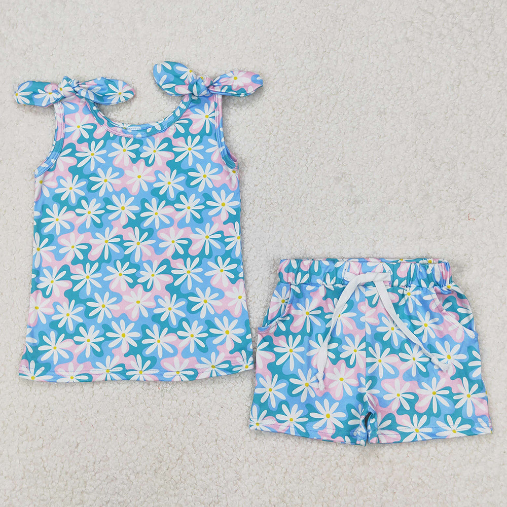 Baby Girls Clothes Blue Flowers Bows Tie Tops Shorts Clothes Sets GSSO2262