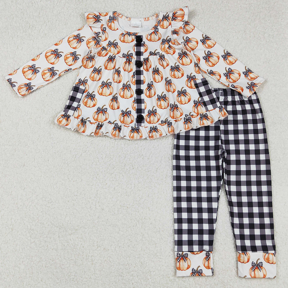 Baby Girls Clothes Button Pockets Pumpkins Tunic Black Plaid Pants Fall Sets GLP2692 9.2
