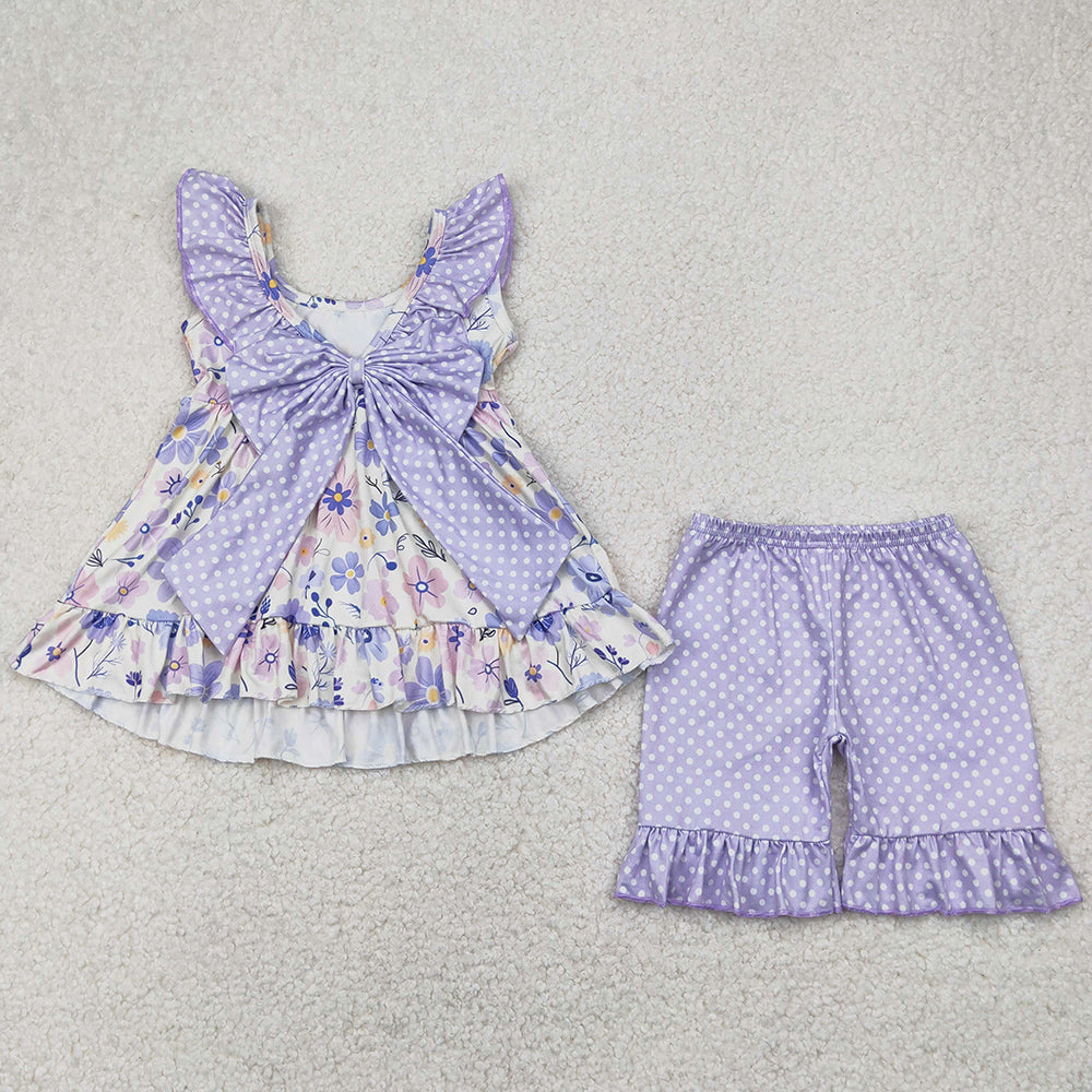 Baby Girls Clothes Lavender Flowers Bow Tunic Tops Ruffle Shorts Sets GSSO2306