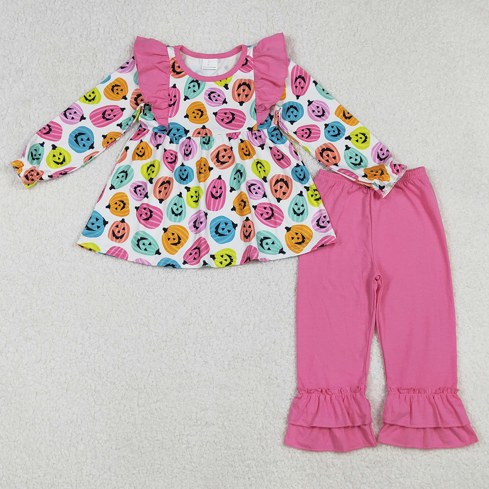 Baby Girls Clothes Long Sleeves Colorful Ghost Pumpkins Top Ruffle Pants Set GLP2569 9.6