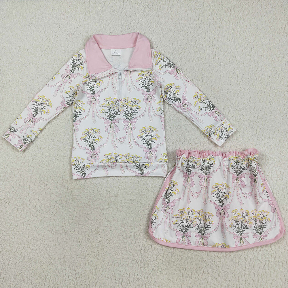 Baby Girls Clothes Pink Bows Flowers Plaid Half Zip Pullpvers Skorts Set GLD1078 8.13