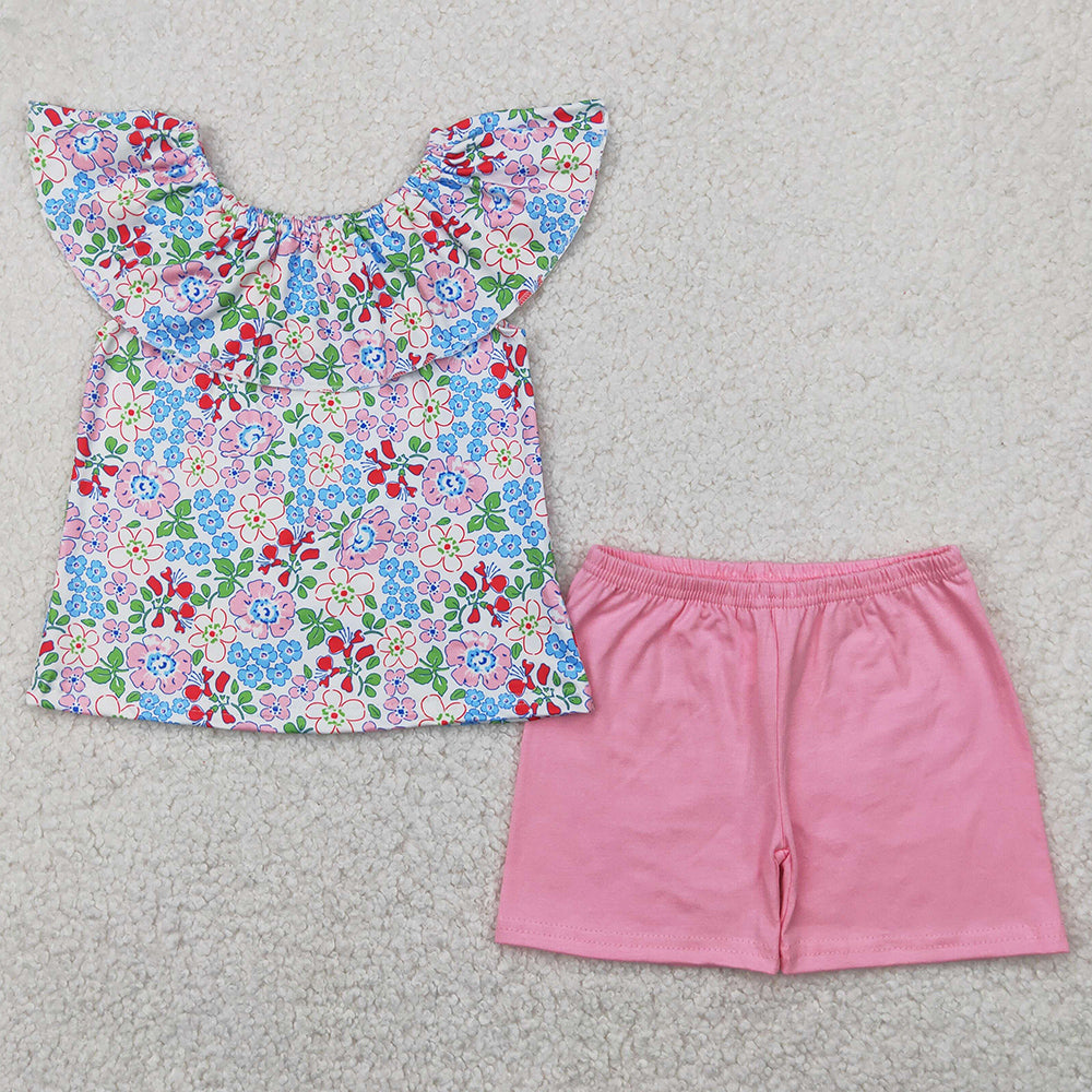 Baby Girls Clothes Pink Flowers Ruffle Tunic Tops Shorts Sets GSSO2277