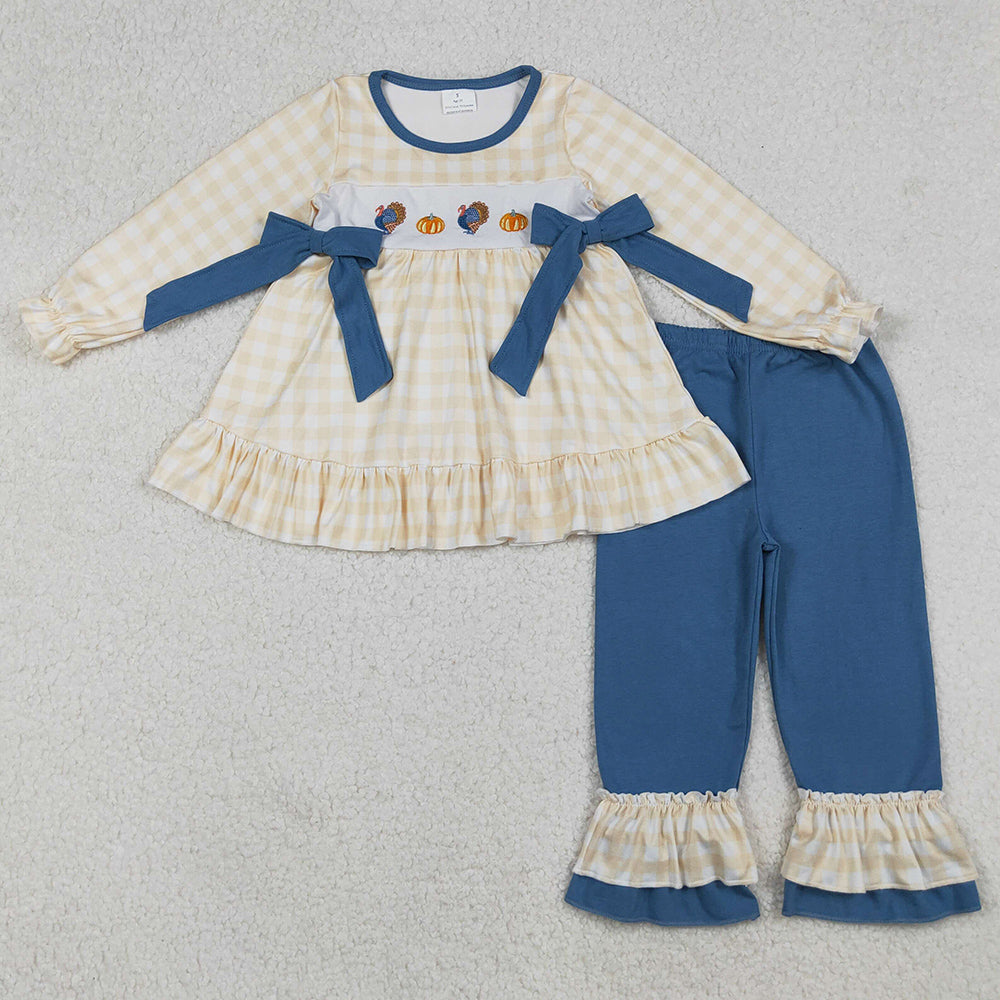 Baby Girls Clothes Thanksgiving Embroidery Turkey Pumpkins Bows Tunic Pants Sets GLP2594 9.9