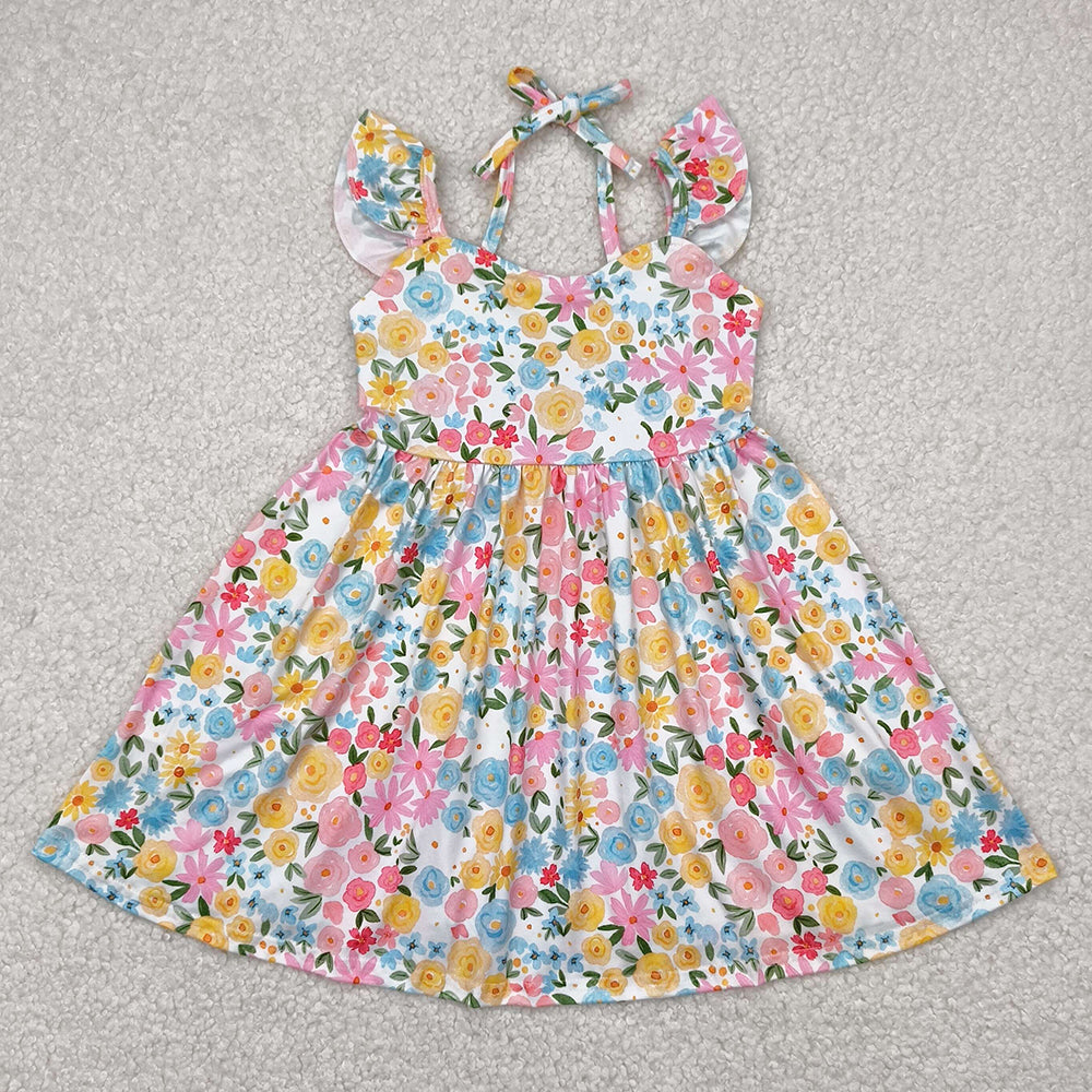 Baby Girls Dress Flutter Sleeves Yellow Floral Backless Bow Knee Length Dresses GSD2207 4.9