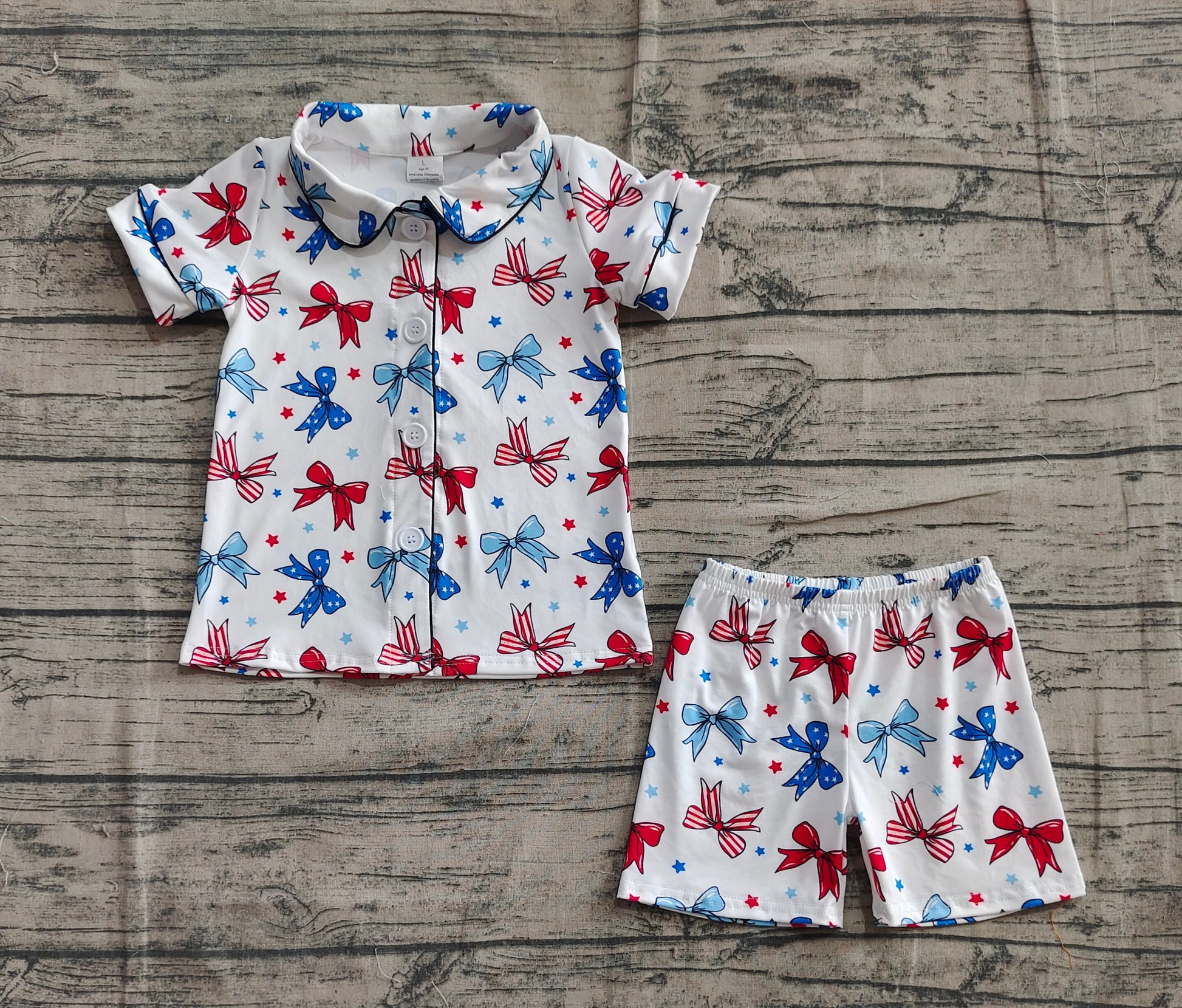 Baby Girls Pajamas Blue Red Bows Button Top Short 4th Of July Pajamas Set Preorder GSSO2484 5.1