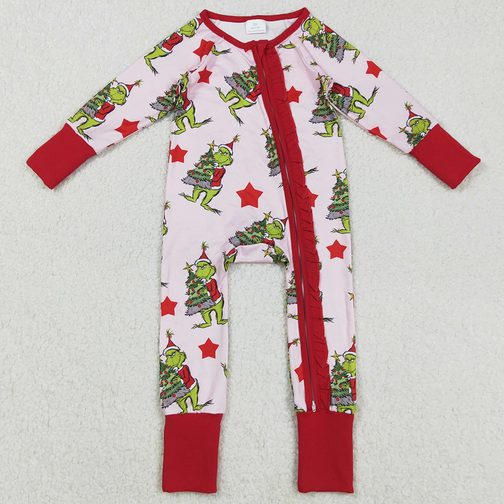 Baby Girls Rompers Green Faces Christmas Trees Ruffle Zipper Rompers LR2496 9.1