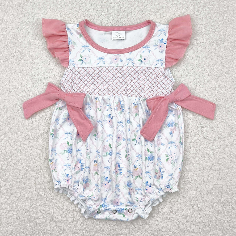 Embroidery Baby Infant Girls Rompers Pink Flutter Sleeves Floral Bows Top Ruffle Rompers SR2923 4.9