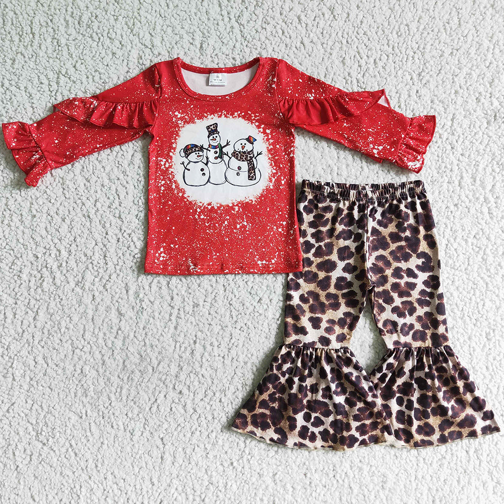 New Design Girls Clothes Christmas Snowman Print Girl Leopard Bell Bottom Outfit GLP0103
