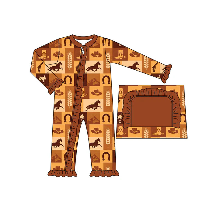 Preorder moq 5 Baby Infant Girls Long Sleeves Horse Boots Plaid Ruffle Zipper Romper 7.12