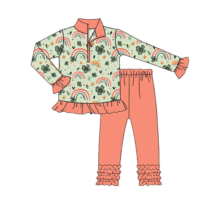 Preorder (moq 8)Baby Girls Clovers Rainbows Zipper Pullover Ruffle Leggings St Patrick Clothes Sets 9.10