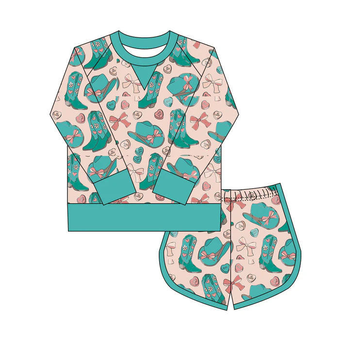Preorder(moq 8)Baby Girls Boots Hats Hearts Plaid Long Sleeve Top Shorts Western Clothes Set 10.1